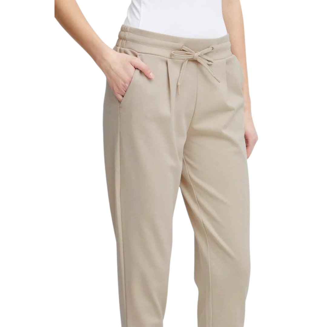 -Pantalon mou à taille régulière élastiquée et muni d'un cordon d'ajustement.