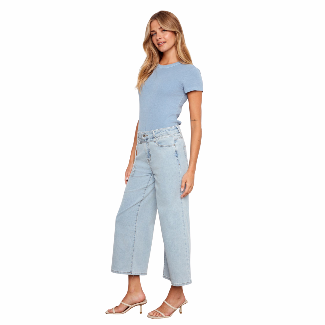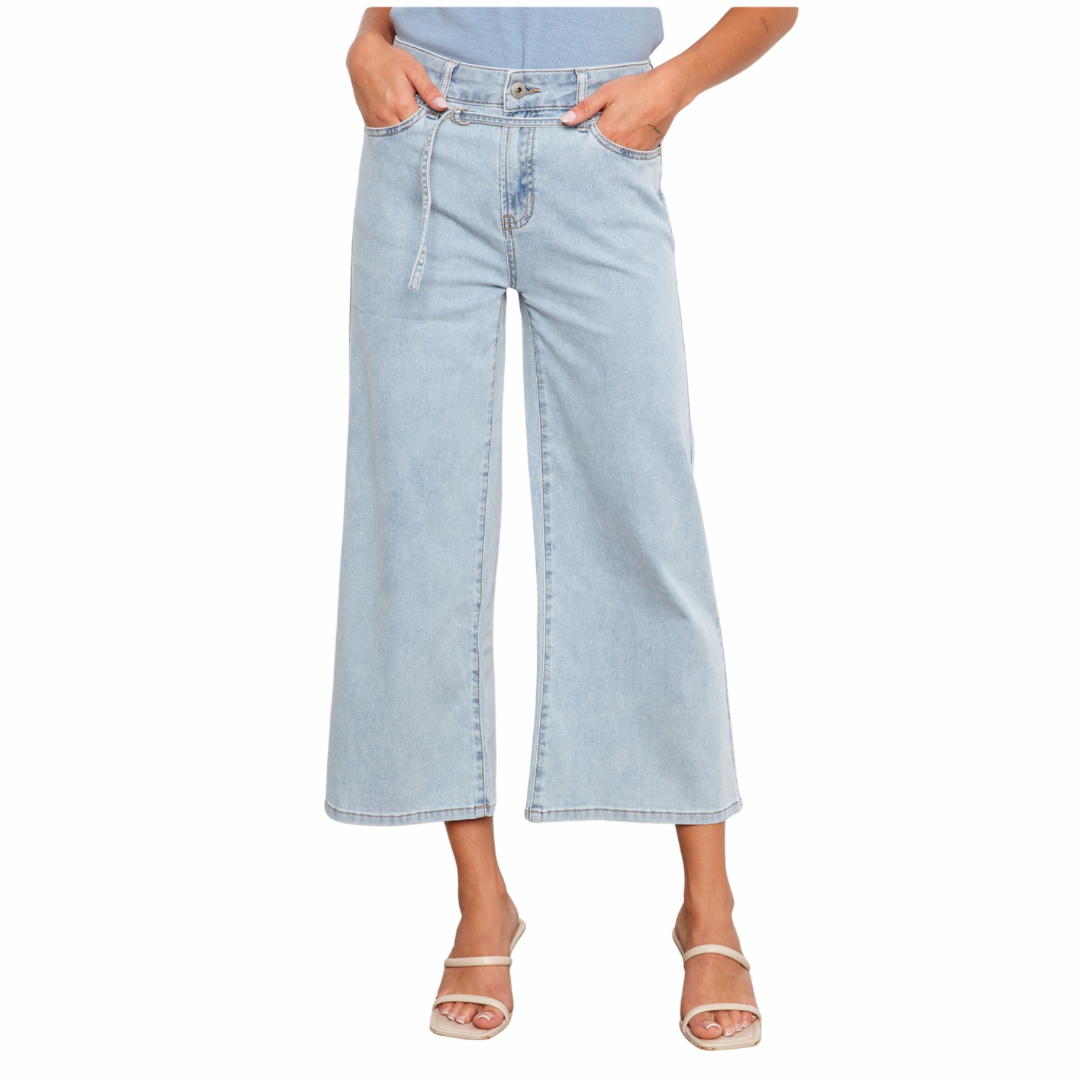 Pantalon court en denim stretch à jambes larges et ceinture