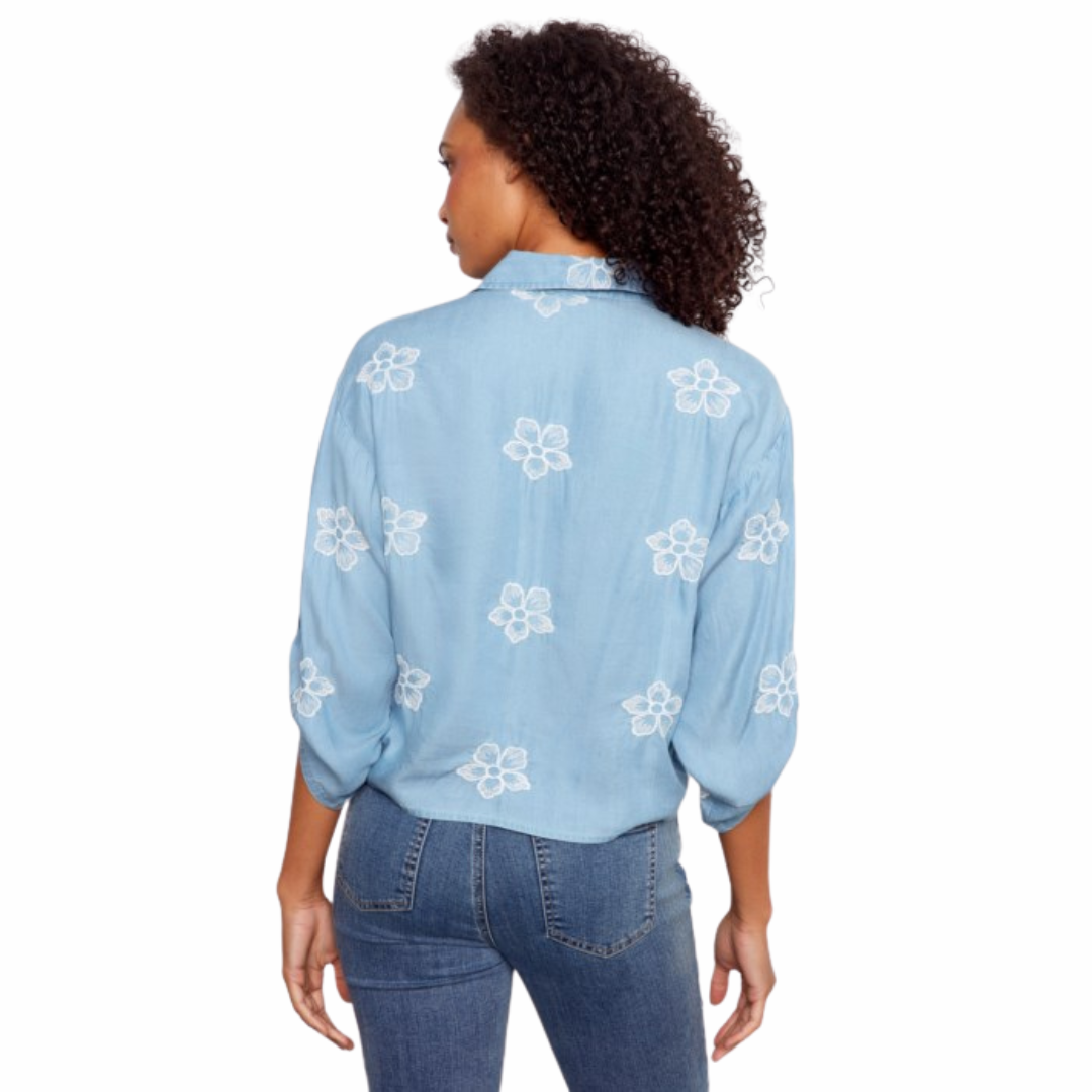 Cette blouse est une véritable invitation à la fraîcheur et à l'élégance décontractée. Sa teinte bleu denim, à la fois douce et lumineuse, est magnifiquement rehaussée par de délicates broderies florales blanches qui apportent une touche de féminité irrésistible. Confectionnée dans une matière fluide et respirante, elle offre un confort absolu tout au long de la journée tout en conservant une tenue impeccable. Son nœud flatteur à la taille et ses manches 3/4 retroussables lui confèrent un style moderne et polyvalent