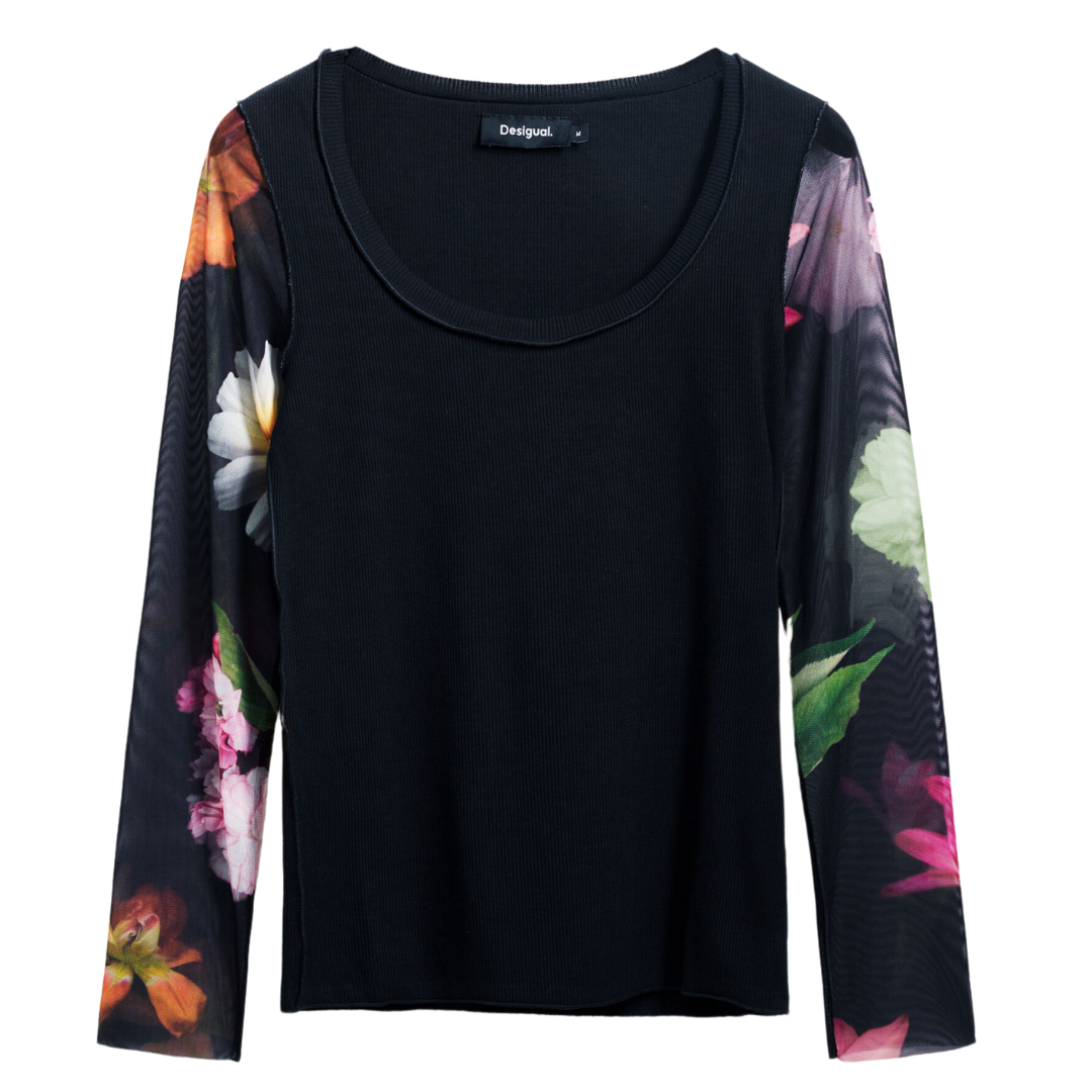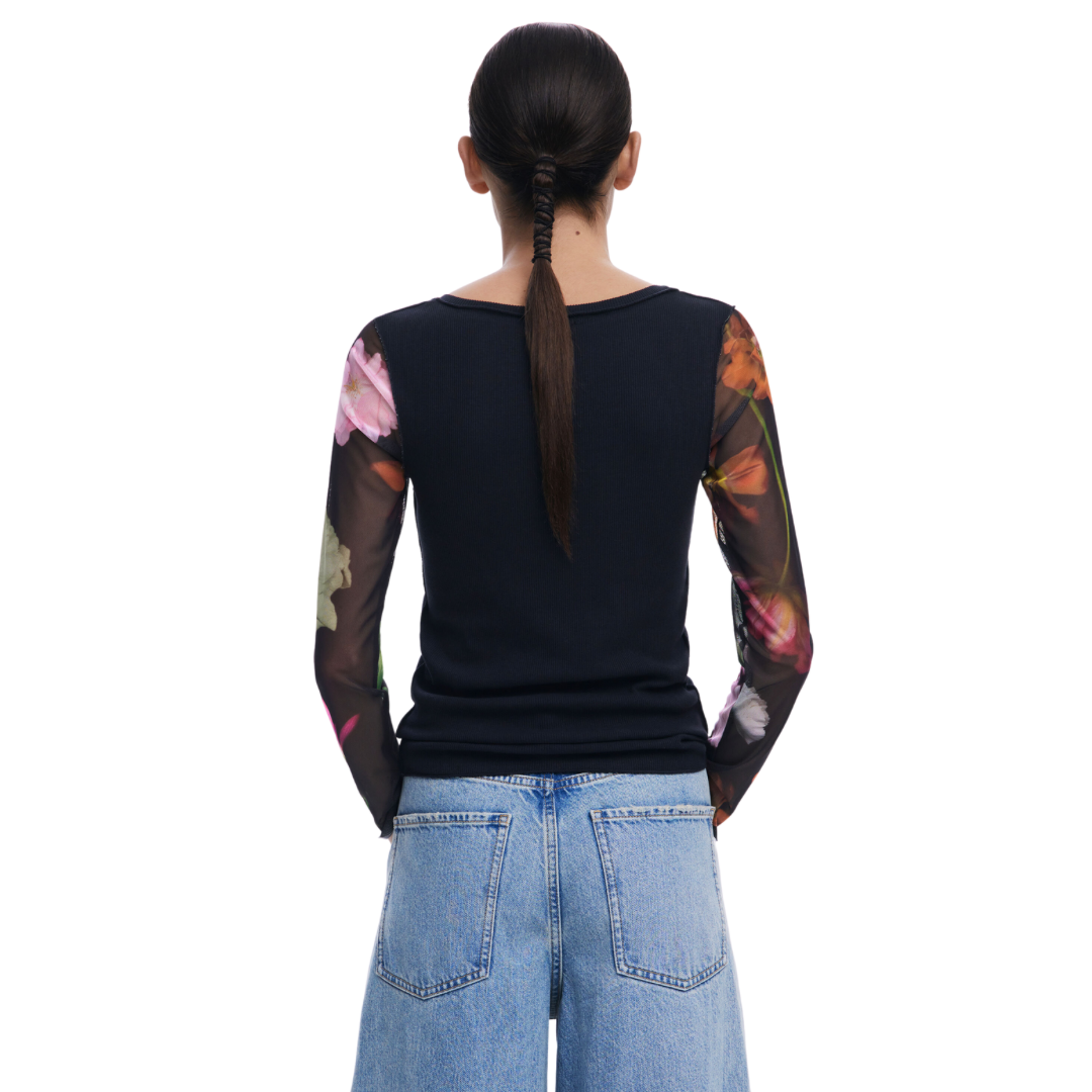T-shirt à manches longues en tulle avec fleurs imprimées et encolure ronde
